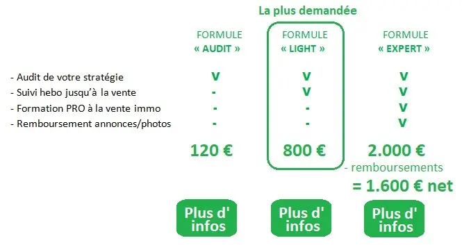 Cette formule comprend les instructions de base + des bilans hebdomadaires en ligne, jusqu’à la vente de votre bien. Je vous conseille sur les meilleures tactiques à adopter dans chaque situation.